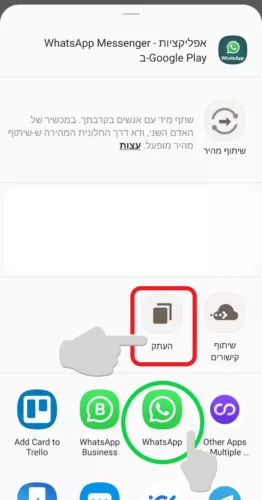6. בתפריט שנפתח נוכל לבחור דרך לשיתוף, ישירות לוואטסאפ או להעתיק את הקישור למכשיר (אחרי שהעתקנו נוכל לשתף את הקישור על ידי הדבקה בהתכתבות עם הנציג)